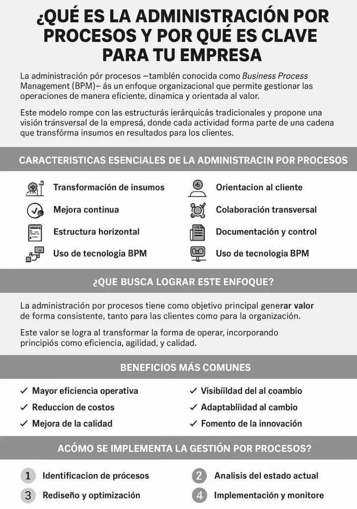 La Administración por Procesos, también conocida como Gestión por Procesos o BPM (Business Process Management), es un enfoque moderno de gestión empresarial que busca mejorar continuamente cómo opera una organización. En lugar de centrarse en estructuras jerárquicas o departamentos aislados, este modelo ve a la empresa como un conjunto de procesos interconectados que transforman insumos en productos o servicios de valor.